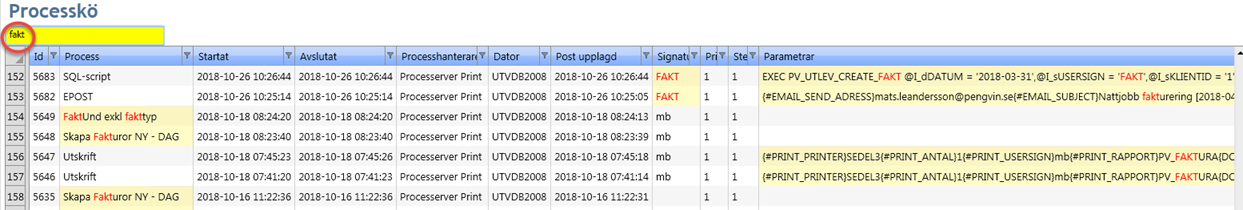 I fliken för processkö har man nu möjlighet att söka genom att mata in valfritt värde (t ex viss listlayout eller visst ord/del av ord eller siffror) i sökrutan under listboxen och trycka [enter]. Sökning sker i samtliga kolumner och vid träff markeras cellen i gult med röd text.