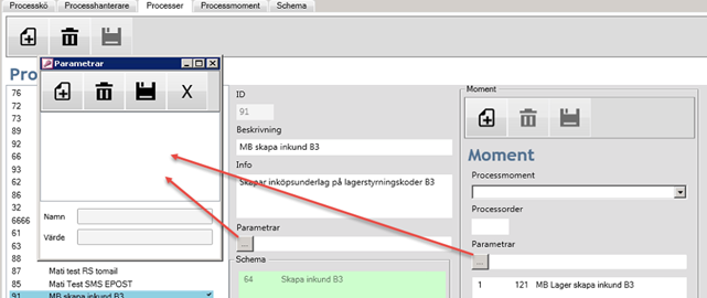Funktionen avser parametrar för hela processen, t ex visst bolag eller lager. I stället för att lägga parametrarna som ett kommando i fliken "Processmoment" kan man ange parametrarna direkt i processen. När man klickar på sökknappen öppnas en dialog som gör det enklare att underhålla parametersträngar.