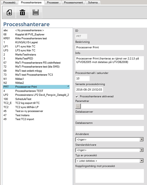 Tänk på att om man byter databas på en processerver och markeringsrutan "Processhanteraren aktiverad" (flik "Processhanterare") inte är markerad, måste tjänsten startas om för att den gamla databasen inte ska synas.