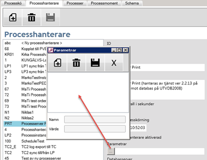 Visar de parametrar som angetts under fliken "Processhanterare".