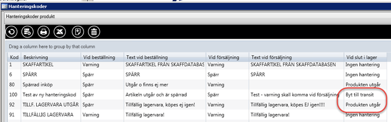 Om lagersaldo är 0 och hanteringskoden "Byt till transit" sätts produktpostens hanteringskod till 0, leveranskod sätt till "Tranist" och beställningspunkt/beställningskvantitet sätts till 0.