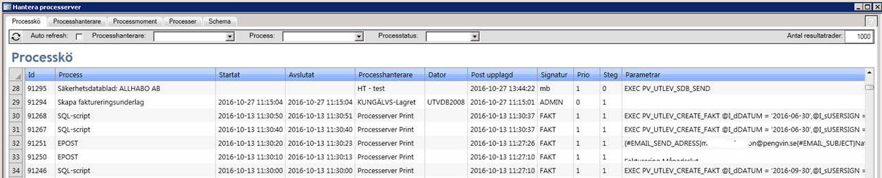 PENGVIN Processerver är en modul för hantering av batchjobb/processer. Funktionellt hanterar processervern mycket av det som den gamla jobbservern hanterade men med en modernare och effektivare teknik.