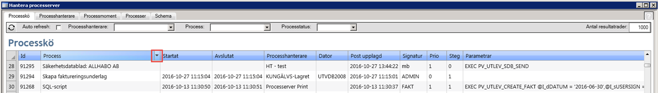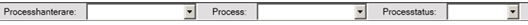 Filtrering/selektering kan ske i varje kolumn. Klicka på den trekant som visas längst till höger på kolumnnamnet på processhanterare , process och processtatus