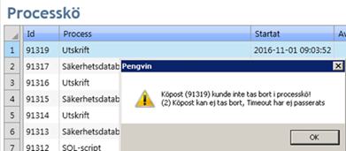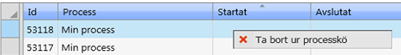Man kan, genom att högerklicka, välja att ta bort processjobb som ännu inte har startats samt ta bort jobb som startats, men inte avslutats, om jobbets starttid plus det antal minuter som angetts i systembeloppet ”Timeoutvärde processerver i minuter” är större än aktuell tid. Om denna tid inte passerats får man ett meddelande om detta om man försöker ta bort jobbet. Även jobb som avslutats går att ta bort.