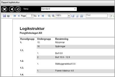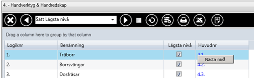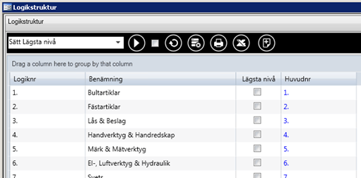 Visar hela logiknumret. Genom att högerklicka på "Huvudnr" får man framval "Nästa nivå" och arbetar på så sätt sig ner i strukturen och lägger till/tar bort nivåer.