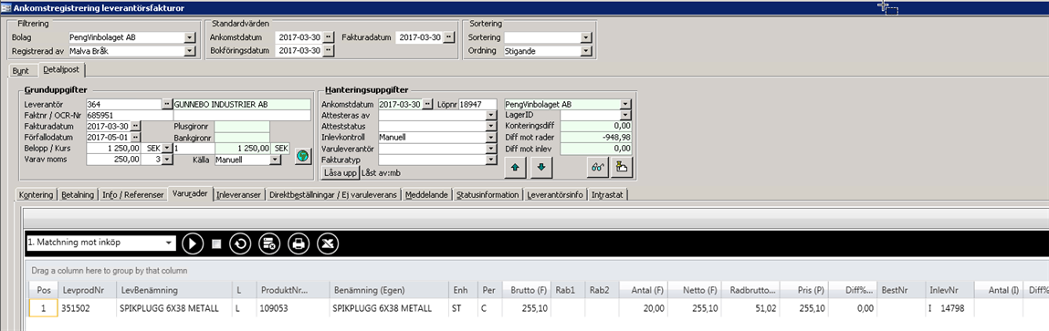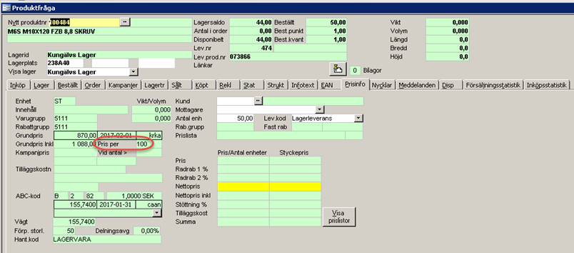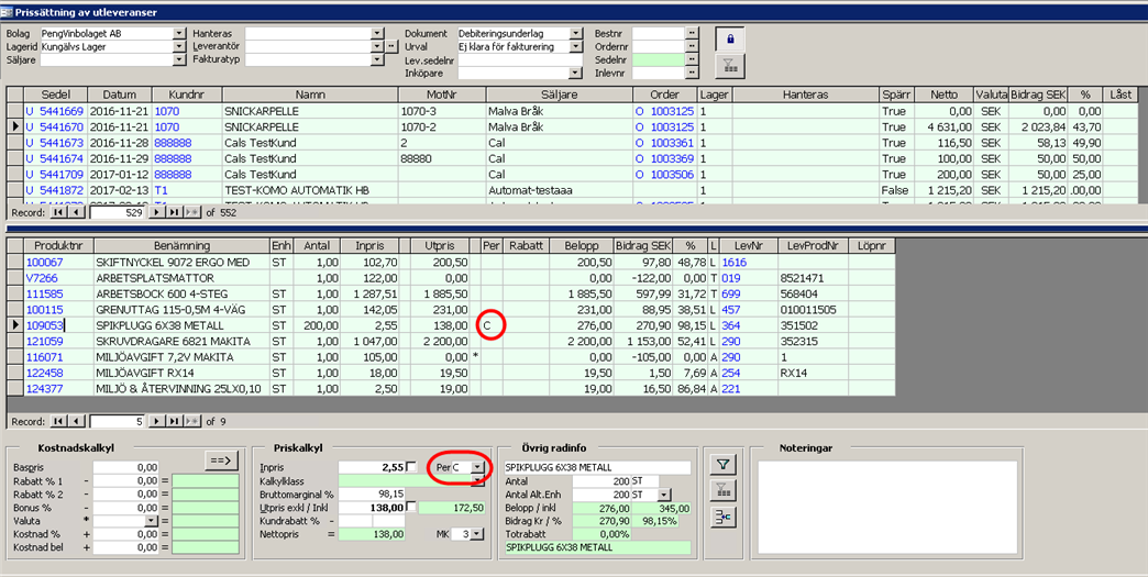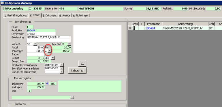 I redigera beställning visas pris per i fliken för varurader. Man har också möjlighet att ändra koden.