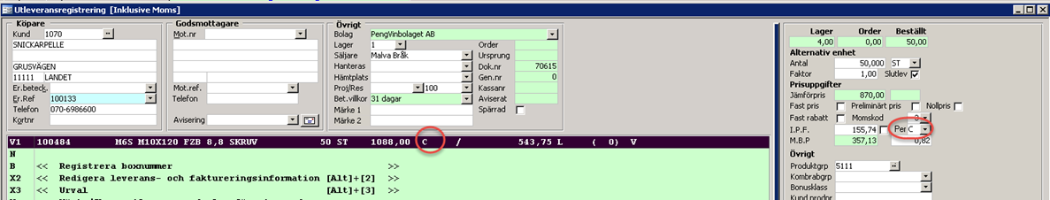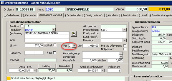 I orderregistreringen visas pris per både i fliken orderrader och i detaljinfo. I detaljinfofliken har man möjlighet att ändra koden.