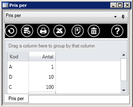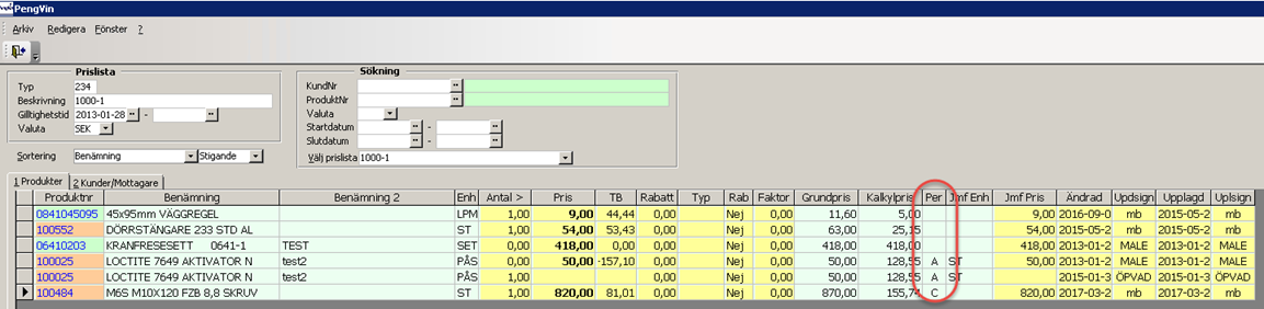 I registret för prislistor redovisas koden för pris per på produktraden.