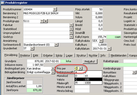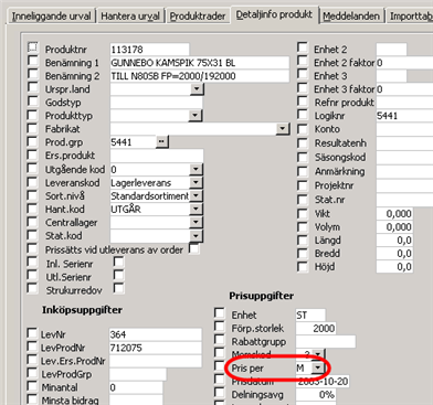 I fliken för detaljinfo produkt har man möjlighet att ändra "pris per" på alla produkter i urvalet på en gång.
