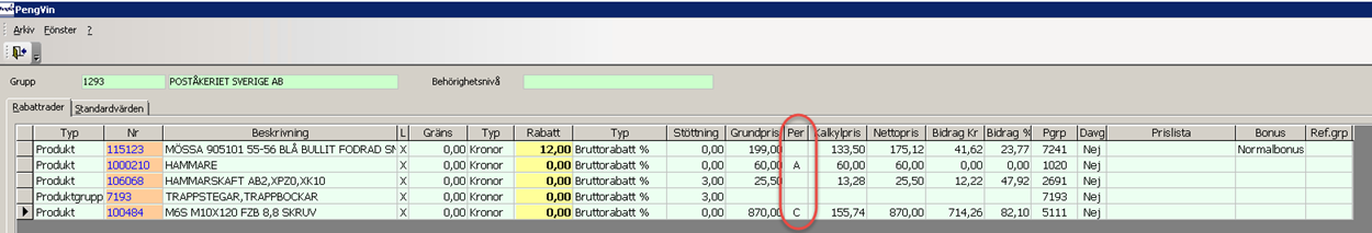 I registret för rabatter redovisas koden för pris per på produktraden.