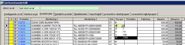 I sortimentsunderhålls flik produktrader har man möjlighet att ändra "pris per" på en produktrad i taget.