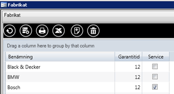 Om rutan är markerad är fabrikatet inte tillgängligt i produkt- och rabattregistret, men kan hanteras i maskinregistret. Fabrikat som läggs upp via maskinregistrets detaljinfo flaggas automatiskt ”Endast för service"