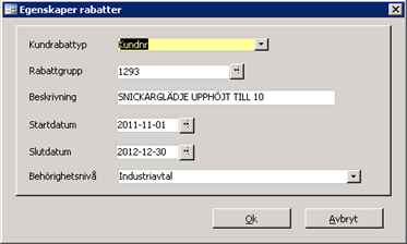 Ange den behörighetsnivå som gäller för att få ändra i rabattregistret. De olika nivåerna för behörighet anger man själv i referensregistret för övriga referenser. Därefter anger man behörighetsnivå i användar- och/eller användargruppsregistret. Man kan tilldela en användare en eller flera olika behörigheter. Det är ingen rangordning inbördes så att den som har en viss behörighet har rätt att ändra rabatter med lägre behörighet med automatik, utan den användare som ska ändra en viss rabattgrupp måste ha den behörigheten tilldelad sig. Behörigheterna i användar- och användargruppregistren slås ihop vilket betyder att en användare som har en viss behörighet i användargruppen och en annan behörighet på användarnivå har både behörighetsgraderna. Det går inte att ge en användare lägre behörighet än vad som finns angivet på användargrupp/användarregister.