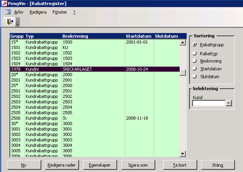 I rabattregistret har man möjlighet att lägga upp två typer av rabattmatriser, Kundnr (som knyts till en viss kund) och Kundrabattgrupp (som kan knyts till flera kunder).