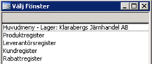 Visar alla öppna dialoger/fönster. Klicka på det fönster som skall ligga överst. Fönsterdialogen går att ändra i storlek och flytta till önskad plats i skärmen.