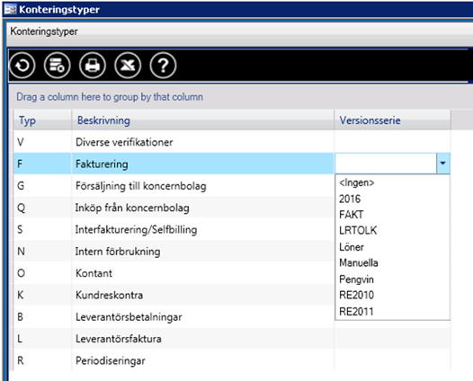 I referensregistret för konteringstyper har man nu möjlighet att sätta upp olika nummerserier per kontotyp om man använder Fenix. Konteringstyperna ligger i PengVin och versionsserierna hämtas från Fenix.