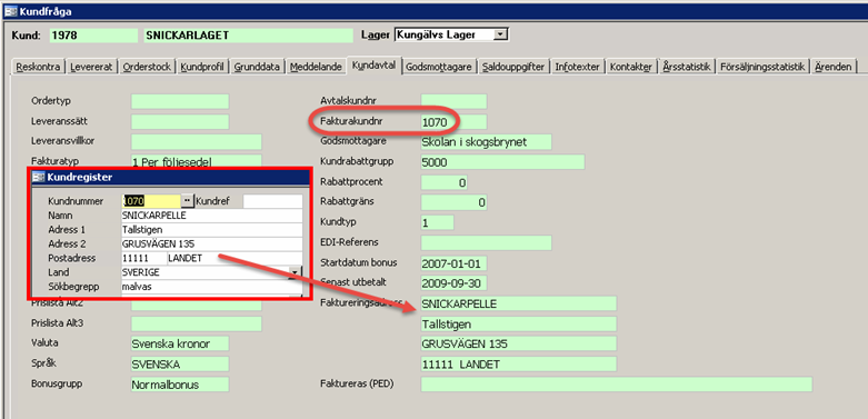 Om det finns ett fakturakundnummer visas fakturakundens adress.
