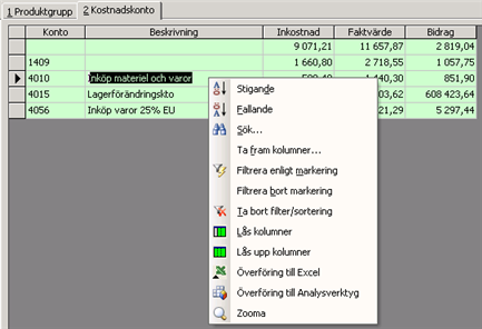 Vid fakturering av kundfaktura ”töms” kolumnerna ”inkostnad”, ”faktvärde”, ”bidrag” och ”bidrag%”.