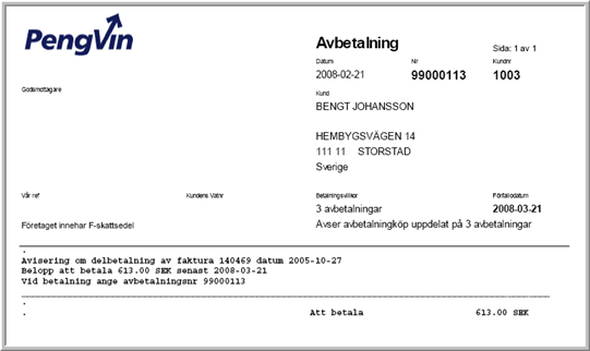 När kunden betalar en av sina aviseringar kan denne ange antingen aviseringsnumret eller det ursprungliga fakturanumret (då bokar PENGVIN av den första aviseringen på aktuellt fakturanummer).