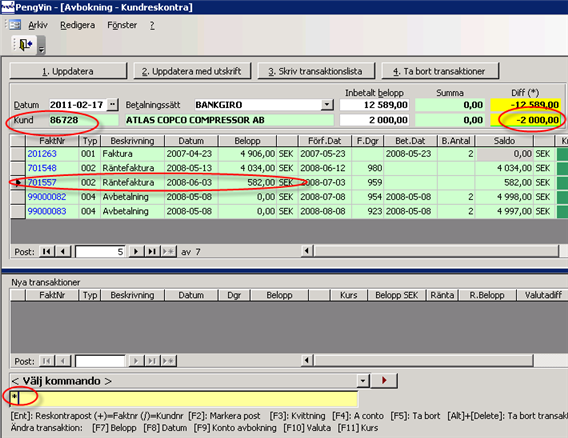 Längst ned finns ett inmatingsfält för fakturanummer, belopp, konto osv. Funktionerna även utföras med mus eller knappar genom att använda "Välj kommando". Genom att klicka på pil-knappen får man fram olika val beroende på vilken flik som är aktiv. I exemplet nedan visas kravhantering.