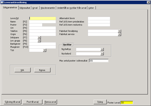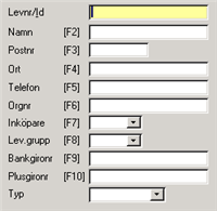 Leverantörsnummer. Fältet kan användas som inmatningsfält för valfritt sökbegrepp. Man använder sedan F-tangenterna för att flytta registrerad text till rätt sökbegrepp. I samband med att F-tangenten trycks sker sökning på begreppet.