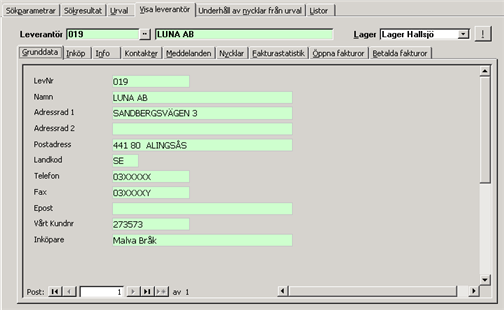 Leverantörsnummer, Namn, Postnummer, Postadress, Telefonnummer, Adress 1 och 2, Leveransgrupp, Inköpare, Organisationsnummer, Nyckeldata, Bank- och plusgiro samt typ.